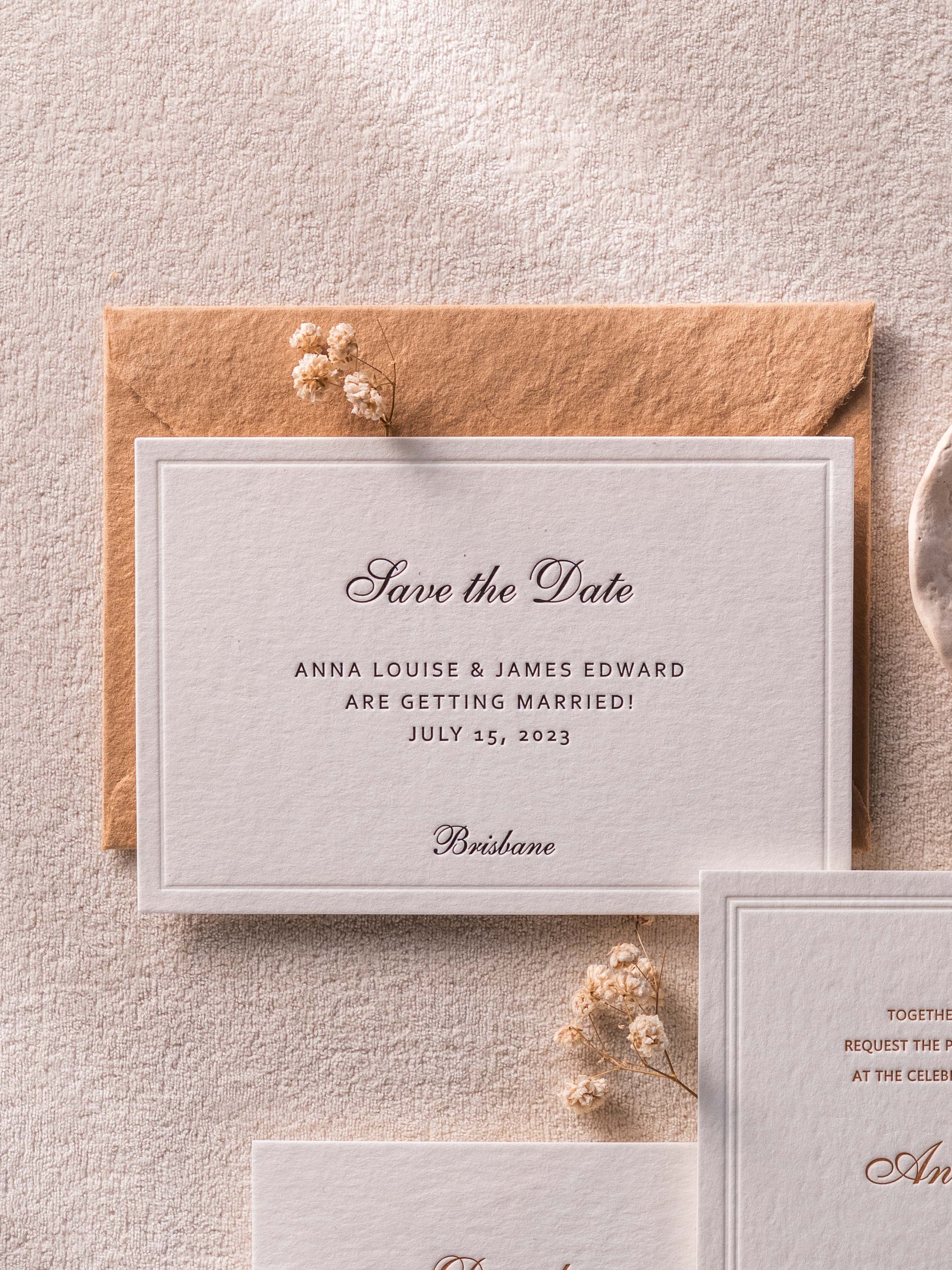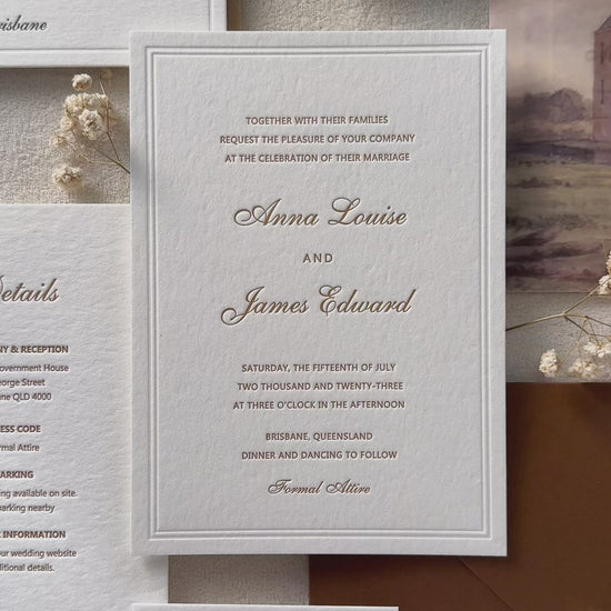 Your invitations are printed using traditional letterpress methods, where ink is pressed into the paper rather than sitting on the surface. This creates the defined debossed texture associated with high-quality letterpress wedding invitations.