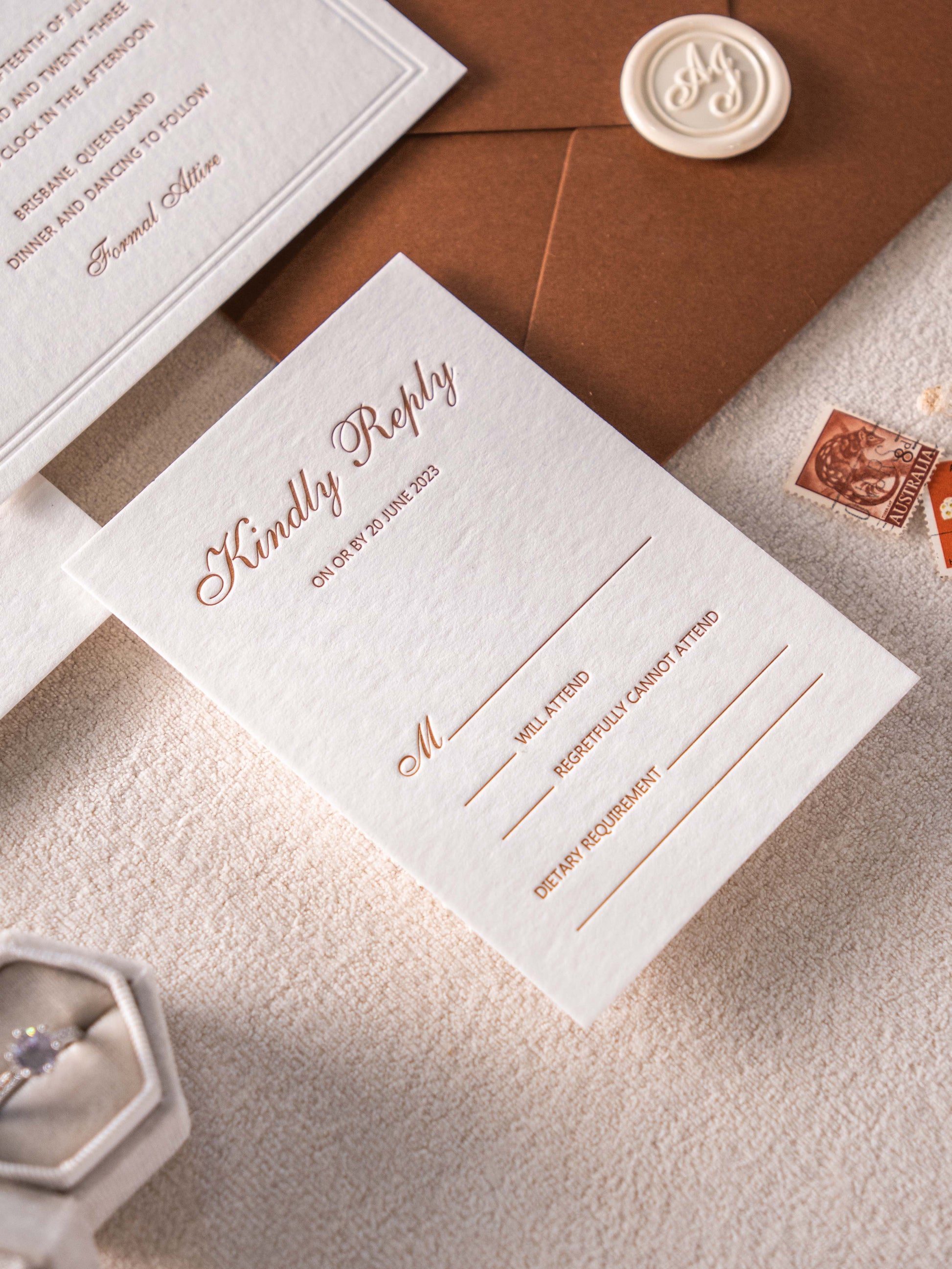 A wax seal can be added to secure the suite, reinforcing the sense of ceremony and tradition. It provides a finishing detail that feels intentional and appropriate for formal invitations.